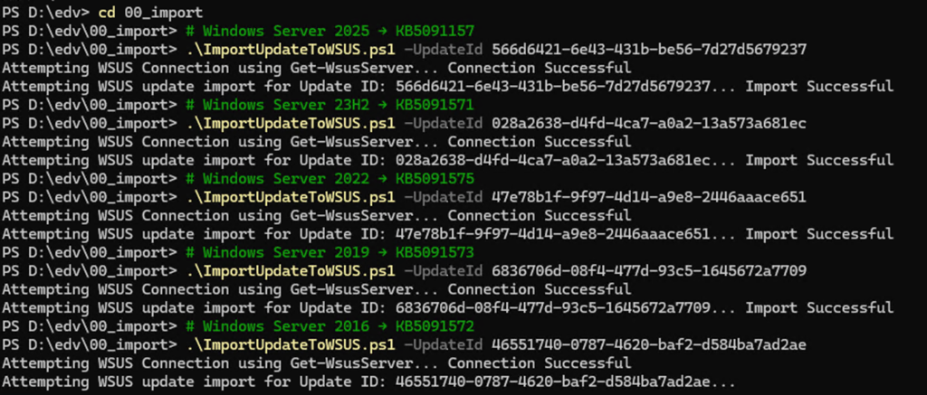 For environments using WSUS, these updates can be imported using Microsoft’s official PowerShell import method.