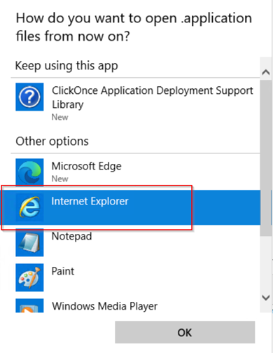 Change the association for extension .application back to Microsoft Internet Explorer IE.