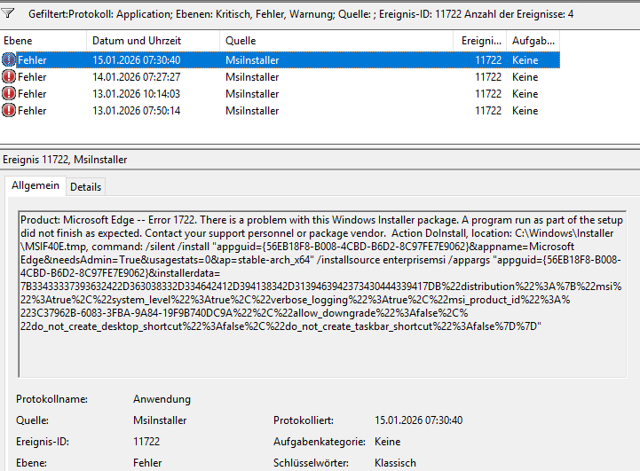 | Product: Microsoft Edge — Error 1722. There is a problem with this Windows Installer package. A program run as part of the setup did not finish as expected. Contact your support personnel or package vendor. Action DoInstall, location: C:\Windows\Installer\MSIF40E.tmp, command: /silent /install “appguid={56EB18F8-B008-4CBD-B6D2-8C97FE7E9062}&appname=Microsoft Edge&needsAdmin=True&usagestats=0&ap=stable-arch_x64” /installsource enterprisemsi /appargs “appguid={56EB18F8-B008-4CBD-B6D2-8C97FE7E9062}&installerdata=7B33433337393632422D363038332D334642412D394138342D3139463942373430444339417DB%22distribution%22%3A%7B%22msi%22%3Atrue%2C%22system_level%22%3Atrue%2C%22verbose_logging%22%3Atrue%2C%22msi_product_id%22%3A%223C37962B-6083-3FBA-9A84-19F9B740DC9A%22%2C%22allow_downgrade%22%3Afalse%2C%22do_not_create_desktop_shortcut%22%3Afalse%2C%22do_not_create_taskbar_shortcut%22%3Afalse%7D%7D” |