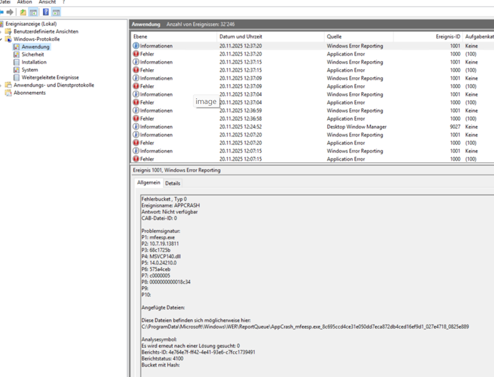 Event 1000 im Windows Event ViewerIm Ereignisprotokoll erscheint ein Application Error (Event 1000), der den Absturz von mfeesp.exe dokumentiert |