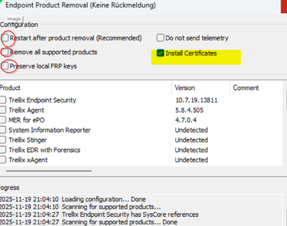 Der einzige funktionierende Workaround fuer die betroffenen Entwicklungsmaschinen bestand darin, alle Trellix-Produkte mit dem Endpoint Product Removal Tool vollstaendig zu entfernen.