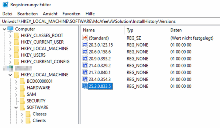 reg query HKEY_LOCAL_MACHINE\SOFTWARE\McAfee\AVSolution\InstallHistory\Versions /reg:64 | findstr “20.9.0 20.6.0 20.3.0 20.1.0 19.11.0 19.7.0 19.5.0 19.3.0 19.1.0 18.12.0 18.9.0 1.5.0”