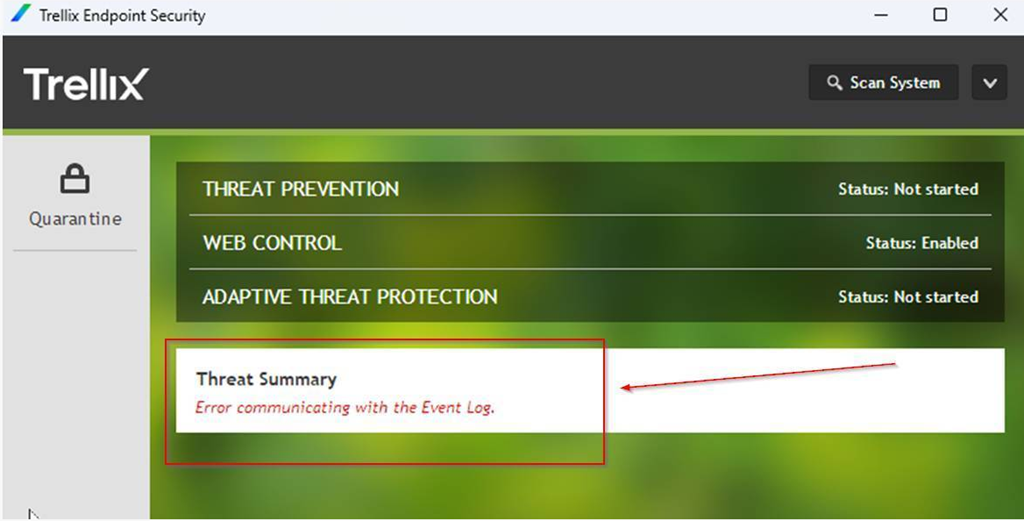 | If you open the Trellix ENS GUI you see “Error communicating with the Event Log” |