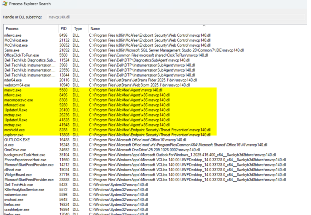 Here you can see a typical Dev machine and what uses Microsoft MSVCP140.DLL we checked if there is DLL hell