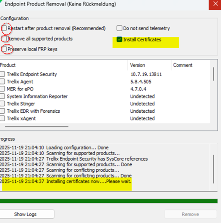 Status 20.11.2025, ongoing problem, Trellix has NOT given a full working solution for all problems