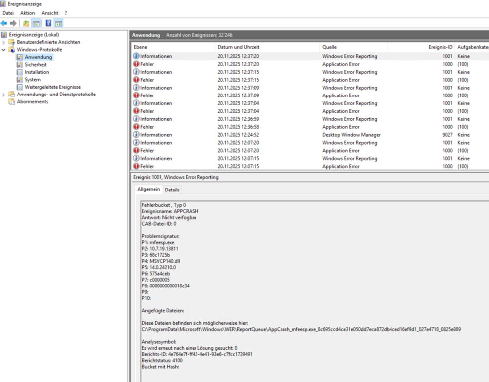 b) This was not too reliable depending on what other people already tried to do. Like follow the Trellix KB and just try to uninstall and reinstall. Then the Event 1000 seemed to disappear so maybe search back more days/hours