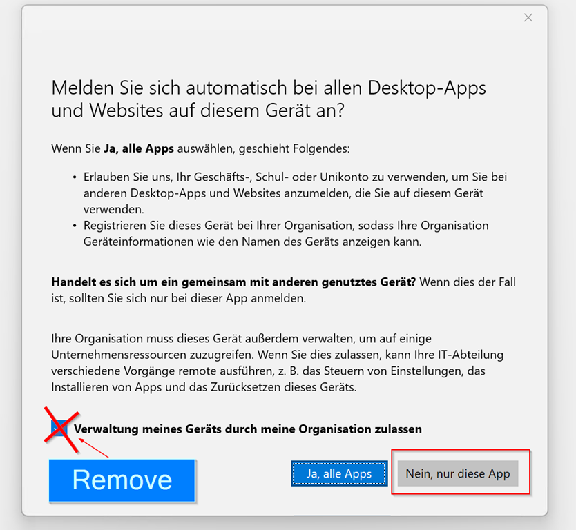If you connect to a customer that manages devices with Intune make sure YOU deselect the BOX right and choose “NO, only this app”. You just need READ access for the report and don’t want the Tenant to manage your IT device.