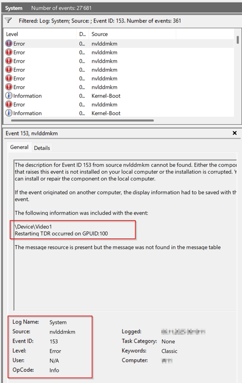The description for Event ID 153 from source nvlddmkm cannot be found. Either the component that raises this event is not installed on your local computer or the installation is corrupted. You can install or repair the component on the local computer. If the event originated on another computer, the display information had to be saved with the event. The following information was included with the event: \Device\Video1 The message resource is present but the message was not found in the message table |