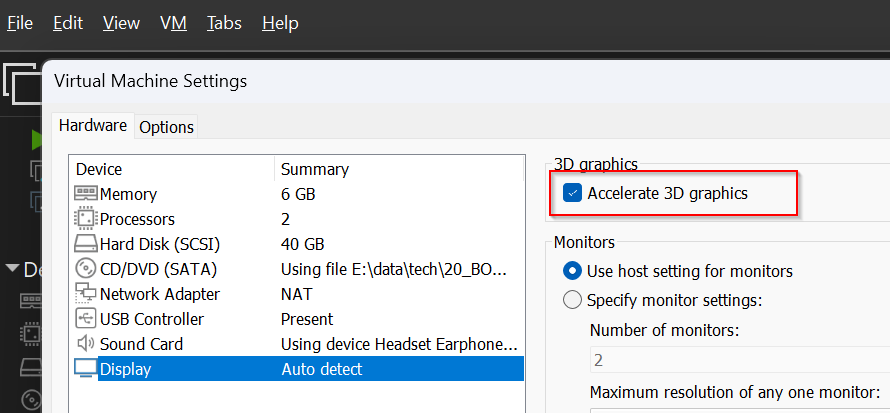 In VMware Workstation, select the VM → Edit virtual machine settings → Display