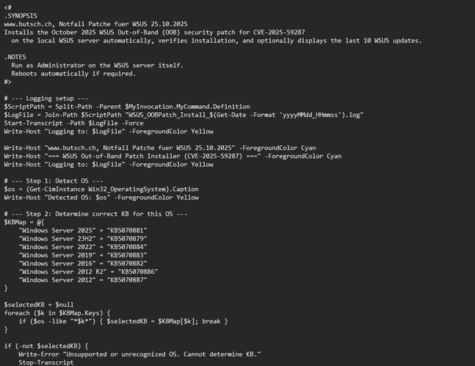 - The 24.10.2025 emergency patches itself are in WSUS. If they are APROVED there our skript will install them from there