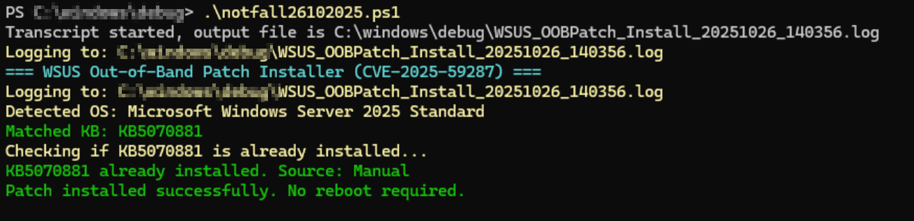 Purpose: Automatically installs the correct October 2025 Out-of-Band (OOB) security patch for CVE-2025-59287 on the local WSUS server, verifying installation and rebooting if required. If the patch is not approved or available in WSUS, it automatically retrieves it from Microsoft Update instead.