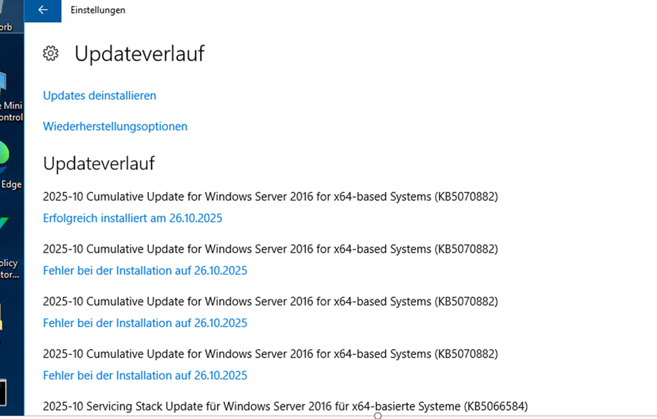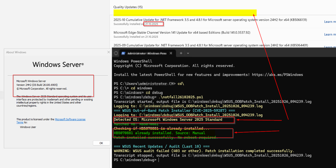 - If you install the Out of Band patches by PS they may not appear in the Windows Server 2025 GUI under history/Verlauf (See and of screenshot, check with Get-HotFix -Id KB5070881 or WMI)